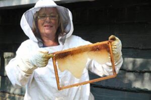 Daar doen we mee aan de workshop “Met de imker op pad”. We beginnen met koffie of thee met appeltaart. Dan krijgen we een rondleiding met uitleg over het belang van bijen en insecten in de natuur. En we kunnen wat honingproducten proeven.